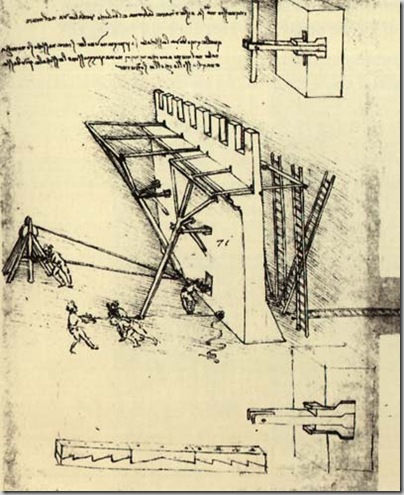 Da Vinci juga mendesain sistem klasik untuk digunakan dalam serbuan ke benteng-benteng kota musuh. Tangganya dibuat khusus dibuat dari roda-roda bergigi. Sebuah engkol memutar rodanya ke belakang dan ke depan yang mengangkat dan menurunkan tangganya.Sumber: http://aneh-tapi-nyata.blogspot.com